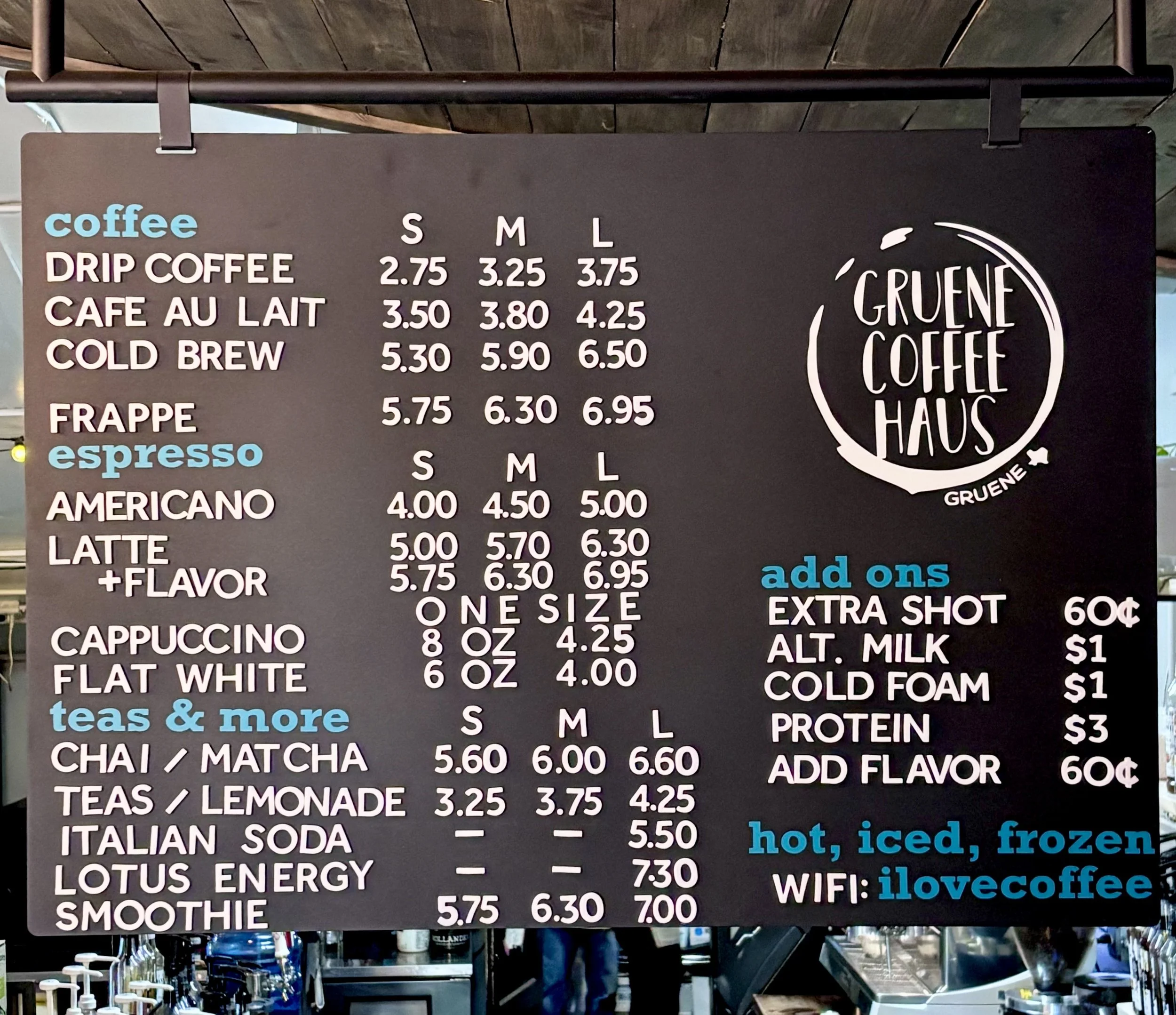 When you visit us in Gruene, you’ll see this menu!! This is just a fraction of the items we offer, so be sure to look for frozen lemonade, craft beer, mimosas, and pastries sourced from local bakeries. We also sell our freshly roasted gourmet coffees by the pound so you can take us home with you!!
